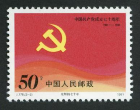 1991年7月1日,中國郵政發(fā)行《中國共產(chǎn)黨成立七十周年》紀(jì)念郵票,一套2枚。第一枚為“中共‘一大’南湖會(huì)議會(huì)址”。畫面暖色調(diào),構(gòu)圖莊重,靜靜的水面映著南湖船的倒影,船身煥發(fā)著金色的、柔和的光輝,把天與水映成一色,帶給人們對這一偉大歷史事件的深切追溯和無限遐想。第二枚為“光輝的七十年”。畫面以一面鮮紅的黨旗全部充滿,下部以紅色基調(diào)變化出過渡色的曲線,表現(xiàn)出旗幟高高飄揚(yáng)。