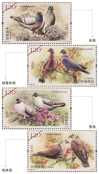 在古代,鴿為人類傳書(shū)送信;到了現(xiàn)代,更是逐漸成為國(guó)際社會(huì)公認(rèn)的和平象征。作為人類的好伙伴,鴿的形象也頻頻出現(xiàn)在各個(gè)國(guó)家的郵票上。自2021年起,中國(guó)郵政《鴿》郵票發(fā)行計(jì)劃被提上日程。論證初期,郵票編輯王僡蘐聯(lián)系到了中國(guó)科學(xué)院動(dòng)物研究所的鳥(niǎo)類專家孫悅?cè)A研究員,請(qǐng)他作為專業(yè)顧問(wèn)為郵票表現(xiàn)的鴿物種等提出建議。孫悅?cè)A此前曾多次參與自然動(dòng)物類題材郵票的論證工作。鴿子屬于鳥(niǎo)綱鴿形目,中國(guó)的鴿屬鳥(niǎo)類分布共有10種。根據(jù)孫悅?cè)A的建議,中國(guó)郵政最終決定《鴿》郵票以中國(guó)境內(nèi)分布的野生鴿作為畫(huà)面主題,4枚郵票分別表現(xiàn)巖鴿、斑尾林鴿、雪鴿、斑林鴿這四種鴿子。孫悅?cè)A表示:“巖鴿是我國(guó)分布范圍最廣、最常見(jiàn)的野生鴿子;斑尾林鴿在中國(guó)雖然分布范圍較小,但在全球范圍內(nèi)分布廣泛,具有一定的國(guó)際性;雪鴿生活在青藏高原地帶,其棲息環(huán)境具有特殊性;而斑林鴿則是我國(guó)外形最為艷麗的野生鴿子之一?!睂O悅?cè)A從地域分布、常見(jiàn)性、國(guó)際性和形態(tài)特征等不同角度考量,力求在4枚郵票的篇幅中更好地展現(xiàn)中國(guó)野生鴿的多元魅力。