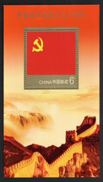 2011年6月22日,中國(guó)郵政發(fā)行《中國(guó)共產(chǎn)黨成立九十周年》紀(jì)念郵票,一套6枚,小型張1枚。郵票圖名為:“開天辟地”“烽火歲月”“執(zhí)政創(chuàng)業(yè)”“改革大潮”“世紀(jì)跨越”“科學(xué)發(fā)展”。小型張名為“中國(guó)共產(chǎn)黨成立九十周年”。紀(jì)念郵票以飄動(dòng)的黨旗作為郵票畫面的基本元素,選取了中國(guó)共產(chǎn)黨各個(gè)時(shí)期具有代表性的典型元素,回顧歷史、展現(xiàn)成就、憧憬未來(lái),充分展現(xiàn)中國(guó)共產(chǎn)黨建黨90周年的光輝歷程。小型張圖案為黨旗,邊飾采用雄偉壯觀的長(zhǎng)城與氣勢(shì)磅礴的黃河,寓意全國(guó)各族人民高舉中國(guó)共產(chǎn)黨的偉大旗幟,一往無(wú)前,實(shí)現(xiàn)中華民族的偉大復(fù)興。