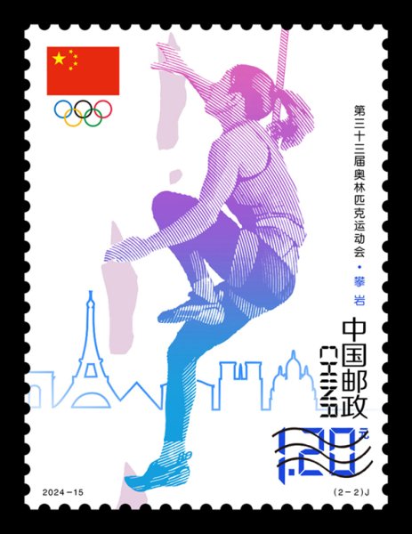 第三十三屆奧林匹克運動會將于法國巴黎當?shù)貢r間2024年7月26日開幕,8月11日閉幕。這是整整一個世紀后,奧運會重回巴黎,法國首都將成為繼倫敦之后第二座三次舉辦夏奧會的城市。該套郵票采用簡約、概括的圖形化設(shè)計方式,展現(xiàn)出兩項運動的精彩瞬間。郵票第1枚表現(xiàn)了男子自由泳的形象,畫面采用從水中仰視的角度,展現(xiàn)運動員劈波斬浪、奮力向前的姿態(tài);第2枚表現(xiàn)了女子速度攀巖的形象,畫面采用斜側(cè)視角,展現(xiàn)運動員抬腿踩點、向上攀拉的動作。兩枚郵票畫面背景表現(xiàn)了埃菲爾鐵塔等巴黎城市建筑,體現(xiàn)出本屆奧運會的地域特色。郵票結(jié)合高精度膠版印刷工藝,整體畫面色彩明亮充滿活力,邊飾漸變過度自然,同時輔以局部燙印工藝,點亮主題背景,增強畫面動感。