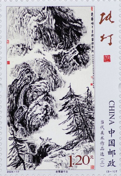 中國郵政定于2024年8月9日發(fā)行《當(dāng)代美術(shù)作品選(三)》特種郵票1套3枚,郵票圖案名稱為老雪凝千古、白云黃鶴、我的祖國·我的人民。全套郵票面值3.60元。郵票計劃發(fā)行數(shù)量為620萬套。