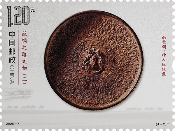 中國(guó)郵政定于2025年5月18日發(fā)行《絲綢之路文物(三)》特種郵票1套4枚,郵票圖案名稱(chēng)為:漢·“五星出東方利中國(guó)”錦護(hù)膊、南北朝·神人紋銀盤(pán)、北周·凸釘玻璃碗、唐·胡人牽駝?shì)d絲壁畫(huà)。全套郵票面值4.80元,計(jì)劃發(fā)行數(shù)量590萬(wàn)套。