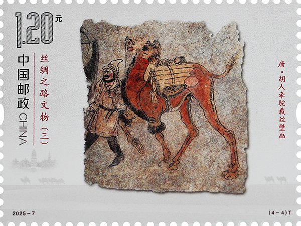 胡人牽駝?shì)d絲壁畫(huà)出土于河南省洛陽(yáng)市安國(guó)相王孺人唐氏墓,現(xiàn)藏于洛陽(yáng)古墓博物館。壁畫(huà)繪制在唐氏墓墓道西壁,正中一匹高大雄健的駱駝昂首挺胸、抬蹄甩尾、闊步前進(jìn)。駱駝背上,是捆扎好的絲綢卷和瓶子。前面牽韁繩的西域人高鼻梁、絡(luò)腮胡,頭戴尖帽,身著翻領(lǐng)長(zhǎng)衫,腳蹬黑色高靿靴,正邁步牽駝前行。該壁畫(huà)生動(dòng)再現(xiàn)了各國(guó)商人來(lái)到絲綢之路的東方起點(diǎn)之一洛陽(yáng),裝載絲綢西行走上絲綢之路的場(chǎng)景,客觀地反映了唐代的社會(huì)場(chǎng)景和世俗風(fēng)情,講述著文明交流互鑒的故事。郵票結(jié)合逆向上光和啞沙工藝,既展現(xiàn)出壁畫(huà)滄桑的歷史變遷,又突出壁畫(huà)中人物、飾物、動(dòng)物等不同的色彩效果,賦予其獨(dú)特的藝術(shù)氣質(zhì)。