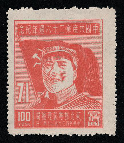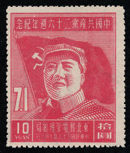 1947年7月1日,東北郵電管理總局發(fā)行《中國共產(chǎn)黨二十六周年紀(jì)念》郵票,一套4枚。郵票圖案為毛澤東頭戴八角帽的正面像,背景為中國共產(chǎn)黨黨旗。畫面上的毛澤東滿面笑容、精神飽滿,展示了黨領(lǐng)導(dǎo)全國人民走向勝利的信心。郵票上方印有“中國共產(chǎn)黨二十六周年紀(jì)念”字樣,在黨旗左下方印有“7.1”數(shù)字,4枚郵票顏色分別采用喜慶的紅色、玫紅、紫紅、桔紅,突出了主題,表達(dá)了全國人民對毛澤東和中國共產(chǎn)黨的熱愛之情。這是第一套紀(jì)念中國共產(chǎn)黨誕生紀(jì)念日的郵票,郵票中的“黨旗”“毛主席像”“7.1”數(shù)字,都成為中國共產(chǎn)黨誕生紀(jì)念郵票的經(jīng)典元素。