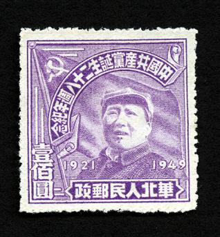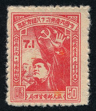 1949年7月1日,旅大郵電管理局發(fā)行《中國(guó)共產(chǎn)黨二十八周年紀(jì)念》郵票,一套1枚。郵票主圖為高高揮動(dòng)左手的毛澤東主席,背后是一面鮮艷的中國(guó)共產(chǎn)黨黨旗;郵票右邊寫有“發(fā)展生產(chǎn),改善民生”,左邊寫有“發(fā)展文化,培養(yǎng)干部”;畫面遠(yuǎn)景為工廠的廠房和煙囪。這枚郵票發(fā)行于中華人民共和國(guó)成立前夕,郵票畫面及文字寓意著即將誕生的新中國(guó)將在毛澤東主席和中國(guó)共產(chǎn)黨的領(lǐng)導(dǎo)下,開啟建設(shè)發(fā)展的新篇章。