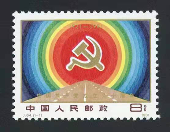 1981年7月1日,中國郵政發(fā)行《中國共產(chǎn)黨成立六十周年》紀(jì)念郵票,一套1枚。郵票畫面為中國共產(chǎn)黨黨徽和大路,背景為紅日及七色光芒。圖案以茫茫宇宙為背景,巧妙地將交叉的鐮刀和鐵錘置于赤、橙、黃、綠、青、藍(lán)、紫組成的七色光環(huán)之中,猶如一面招展的黨旗,創(chuàng)造出了“共產(chǎn)黨像太陽,照到哪里哪里亮”的深刻意境。畫面下方是一條畫著白色交通指示線的漫長道路,寬闊、平坦,象征著中國共產(chǎn)黨領(lǐng)導(dǎo)中國人民正在進(jìn)行的社會(huì)主義建設(shè)事業(yè),前景無限美好光明。