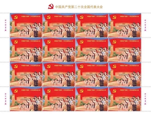 中國(guó)郵政定于2022年10月16日發(fā)行《中國(guó)共產(chǎn)黨第二十次全國(guó)代表大會(huì)》紀(jì)念郵票一套2枚,小型張1枚。郵票第一圖名稱(chēng)為“奮進(jìn)新征程”,第二圖名稱(chēng)為“建功新時(shí)代”,小型張圖案名稱(chēng)為“慶祝中國(guó)共產(chǎn)黨第二十次全國(guó)代表大會(huì)勝利召開(kāi)”。全套郵票面值8.40元。郵票計(jì)劃發(fā)行數(shù)量為1390萬(wàn)套,小型張計(jì)劃發(fā)行數(shù)量790萬(wàn)枚。