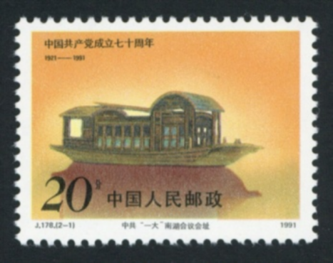 1991年7月1日,中國郵政發(fā)行《中國共產(chǎn)黨成立七十周年》紀(jì)念郵票,一套2枚。第一枚為“中共‘一大’南湖會(huì)議會(huì)址”。畫面暖色調(diào),構(gòu)圖莊重,靜靜的水面映著南湖船的倒影,船身煥發(fā)著金色的、柔和的光輝,把天與水映成一色,帶給人們對這一偉大歷史事件的深切追溯和無限遐想。第二枚為“光輝的七十年”。畫面以一面鮮紅的黨旗全部充滿,下部以紅色基調(diào)變化出過渡色的曲線,表現(xiàn)出旗幟高高飄揚(yáng)。