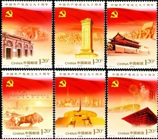 2011年6月22日,中國(guó)郵政發(fā)行《中國(guó)共產(chǎn)黨成立九十周年》紀(jì)念郵票,一套6枚,小型張1枚。郵票圖名為:“開天辟地”“烽火歲月”“執(zhí)政創(chuàng)業(yè)”“改革大潮”“世紀(jì)跨越”“科學(xué)發(fā)展”。小型張名為“中國(guó)共產(chǎn)黨成立九十周年”。紀(jì)念郵票以飄動(dòng)的黨旗作為郵票畫面的基本元素,選取了中國(guó)共產(chǎn)黨各個(gè)時(shí)期具有代表性的典型元素,回顧歷史、展現(xiàn)成就、憧憬未來(lái),充分展現(xiàn)中國(guó)共產(chǎn)黨建黨90周年的光輝歷程。小型張圖案為黨旗,邊飾采用雄偉壯觀的長(zhǎng)城與氣勢(shì)磅礴的黃河,寓意全國(guó)各族人民高舉中國(guó)共產(chǎn)黨的偉大旗幟,一往無(wú)前,實(shí)現(xiàn)中華民族的偉大復(fù)興。