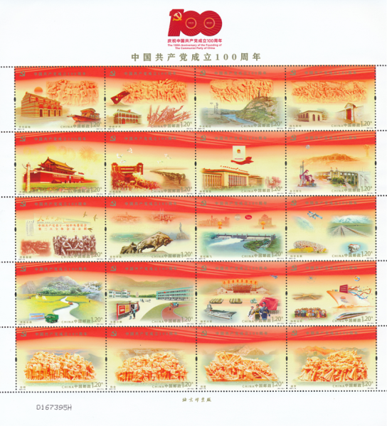 2021年7月1日,中國郵政發(fā)行《中國共產(chǎn)黨成立100周年》紀念郵票,一套 20枚。郵票采用連票設(shè)計形式,以紅色、金色為畫面主基調(diào),運用油畫寫實手法表現(xiàn),并采用連綿不斷的飄帶貫穿整體,寓意中國共產(chǎn)黨百年奮斗的光輝歷程。該套郵票特別使用兩色紅熒光油墨,在紫光燈下,慶祝建黨百年標識、“一大會址”、“天安門”等郵票主體元素閃放璀璨的光芒。