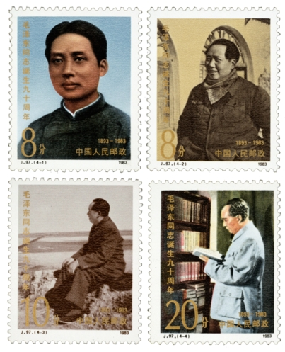 中國(guó)郵政于1983年12月26日發(fā)行《毛澤東同志誕生九十周年》紀(jì)念郵票一套4枚,郵票圖案名稱分別為毛澤東同志一九二五年在廣州、毛澤東同志一九四五年在延安、毛澤東同志一九五二年視察黃河、毛澤東同志一九六一年在江西。