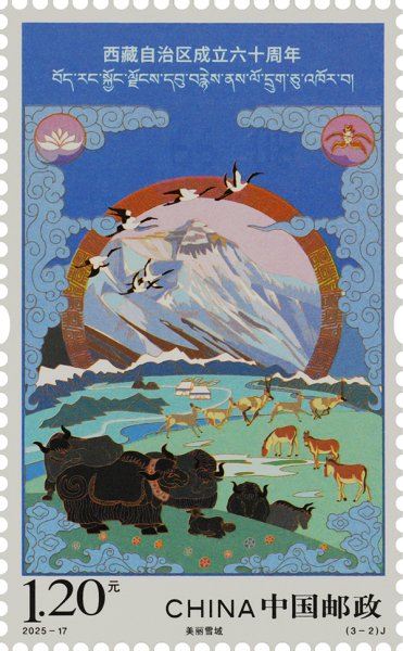中國郵政定于2025年8月15日發(fā)行《西藏自治區(qū)成立六十周年》紀(jì)念郵票1套3枚,郵票圖案名稱為:同心筑夢、美麗雪域、幸福高原。全套郵票面值3.60元,計劃發(fā)行數(shù)量為490萬套。