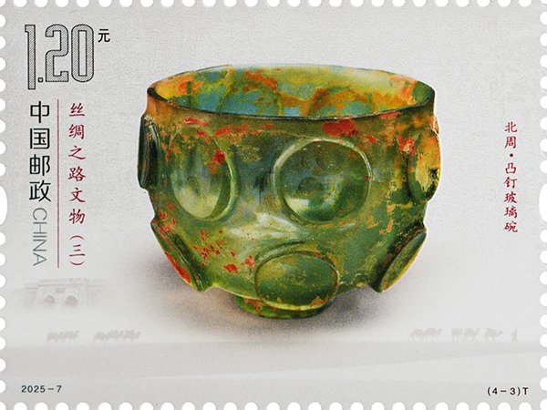 凸釘玻璃碗出土于寧夏固原市南郊的北周李賢夫婦合葬墓,現(xiàn)藏于寧夏回族自治區(qū)固原博物館。該碗為直口,矮圈足,通體透明,呈碧綠色,外壁飾以14個(gè)凸起的圓形裝飾兩周,上下錯(cuò)位排列。其內(nèi)壁光潔,外壁有薄層的金黃色分化物,其材質(zhì)屬鈣鈉玻璃,含有較多其它礦物質(zhì),該形制在薩珊時(shí)期的伊朗高原十分流行。郵票將特種光油和三維浮雕起凸組合應(yīng)用,玻璃碗晶瑩剔透的質(zhì)感和立體感躍然紙上。固原作為絲綢之路西北咽喉門(mén)戶(hù),見(jiàn)證了東西方文化交流交融,提供了考察當(dāng)時(shí)東西方貿(mào)易極為重要的資料。