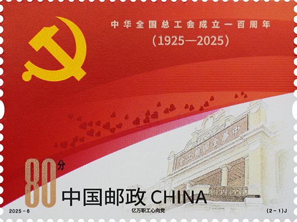 中國郵政定于2025年5月1日發(fā)行《中華全國總工會成立一百周年》紀念郵票1套2枚,郵票圖案名稱為:億萬職工心向黨、團結奮斗新征程。全套郵票面值2.00元,計劃發(fā)行數量570萬套。